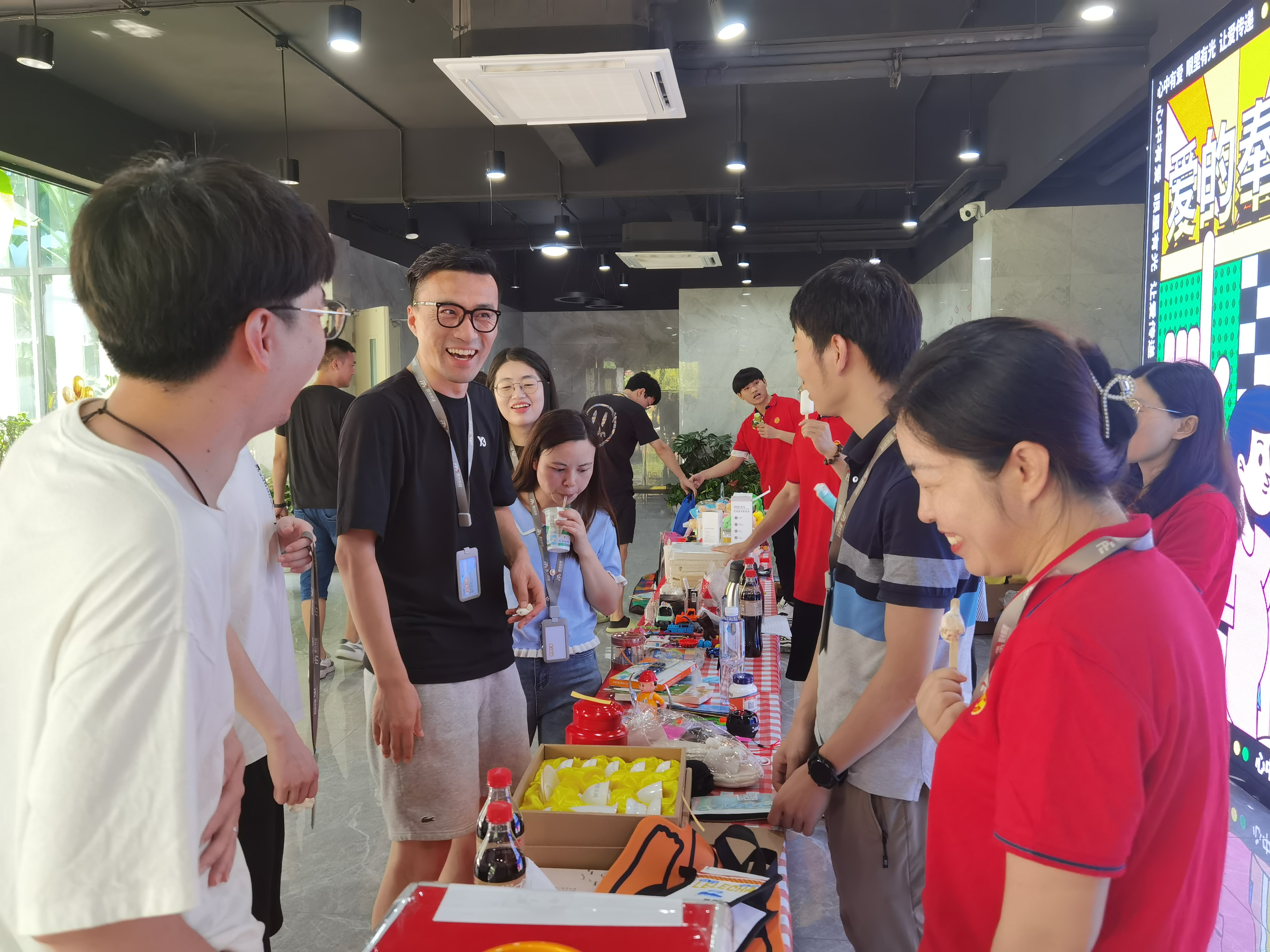 還有員工直接從義賣點旁的小賣部購買了一箱可樂捐贈給義賣點,3元的可樂好些員工默默轉(zhuǎn)賬5元購買;有員工買了一堆義賣的可愛毛絨玩具打算送給辦公室的女孩兒們;有員工購買了義賣品后帶來了一群小伙伴到現(xiàn)場獻愛心……因為有愛,所以相聚,因為有光,所以溫暖。