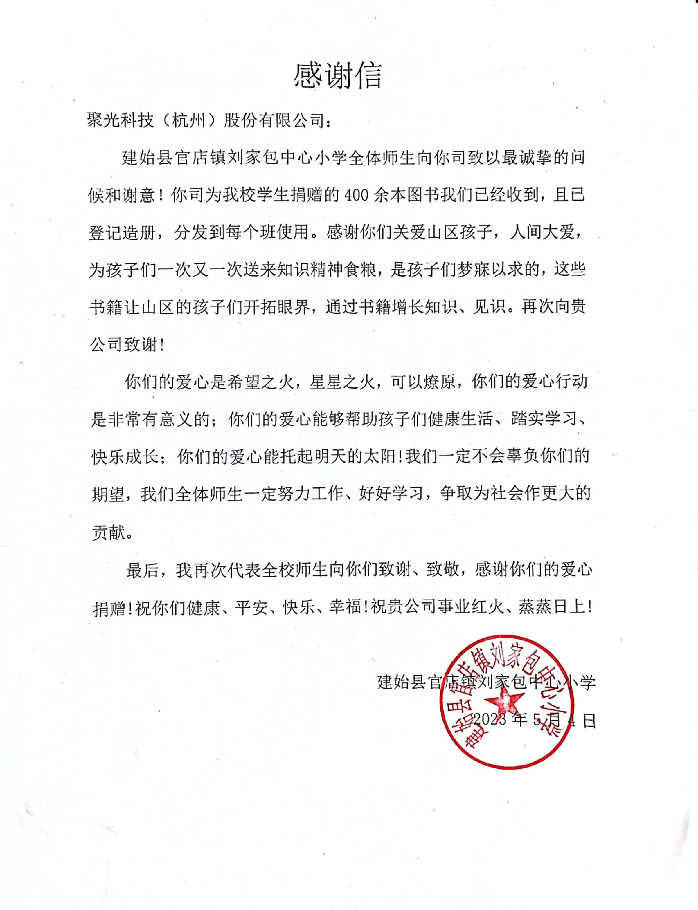 5月8日,聚光科技收到了一封來自建始縣官店鎮(zhèn)劉家包中心小學(xué)的感謝信,對聚光科技所捐贈的400余本愛心圖書表示衷心的感謝。這些愛心書籍飽含了聚光科技對山區(qū)兒童的牽掛和期望,希望他們通過書籍看到更大的世界,播下夢想的種子,努力用知識改變命運(yùn),去創(chuàng)造屬于自己的燦爛人生。