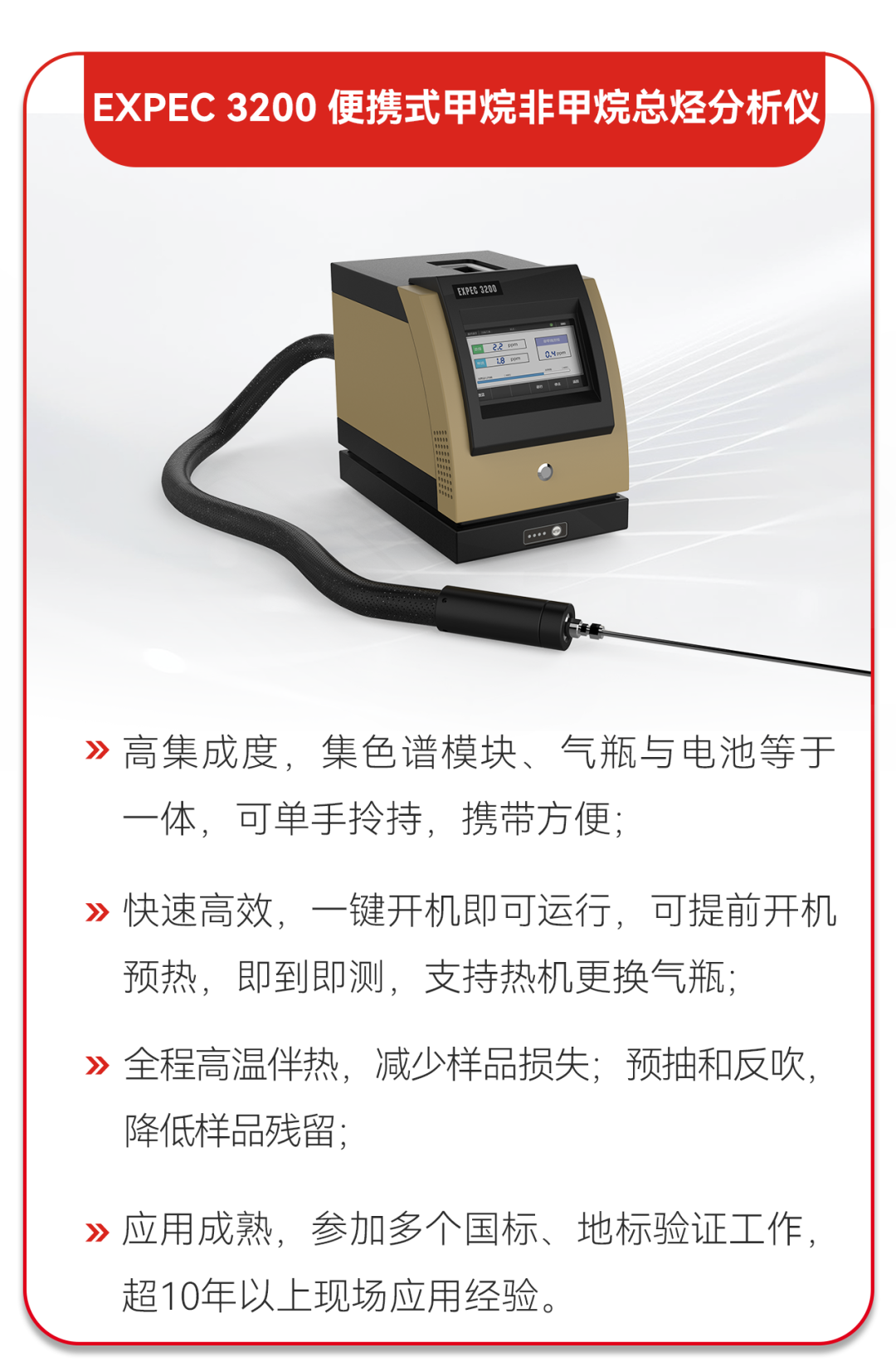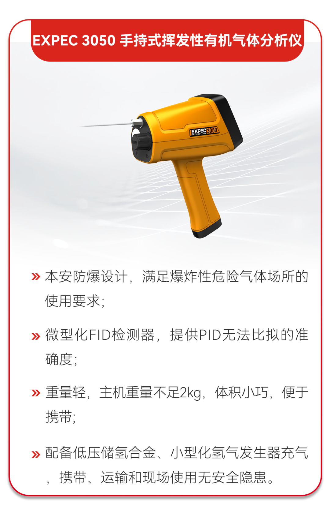 據(jù)譜育科技技術(shù)人員介紹:“EXPEC 3050 手持式揮發(fā)性有機氣體分析儀內(nèi)部搭載FID檢測器,具備‘秒級響應’的數(shù)據(jù)分析反饋能力,能幫助督查人員快速進行VOCs物料泄漏勘察工作,檢測現(xiàn)場總烴數(shù)值是否存在異常,3-5s的實際響應時間便可得到VOCs泄漏氣體的具體濃度數(shù)值?!?/span>