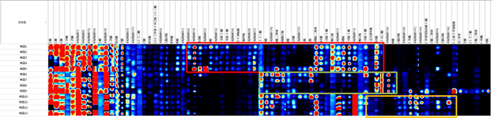 下圖為 13組枸杞原漿樣品的指紋譜圖,由指紋譜圖可以直觀觀察到不同類別樣品中物質(zhì)的差異,并建立與其相對應(yīng)的特征指紋圖譜。其中框內(nèi)化合物為產(chǎn)生差異較大的30種化合物。紅色框內(nèi)為鑒定一類樣品的特征物質(zhì),為檸檬烯,1-戊烯-3 酮,甲酸乙酯,異戊醛,1-辛烯 3 酮;綠色框內(nèi)為鑒定二類樣品的特征物質(zhì)2,3-戊二酮,庚醛等;黃色框內(nèi)為鑒定三類樣品的特征物質(zhì)2-辛酮,乙酸戊酯等。