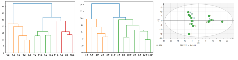 PCA 法主成分得分圖顯示1- 5號較為接近(1號與組內(nèi)差異較大);6、8、10、11號較為接近(11號與組內(nèi)差異較大);7、9、12、13 號組成較為相似。